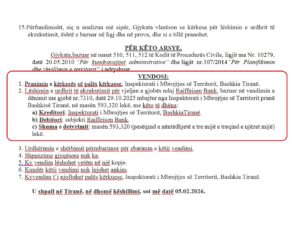 Më 5 shkurt 2026, gjykata ka vendosur që Raiffeisen Bank të paguajë gjobën e vendosur nga IMT, si dhe interesat si kamatëvonesë, duke e çuar në afro 6 mijë euro faturën për bankën. Mbetet për t’u parë nëse banka ka reaguar apo do të reagojë edhe për heqjen e ndërtimit pa leje.