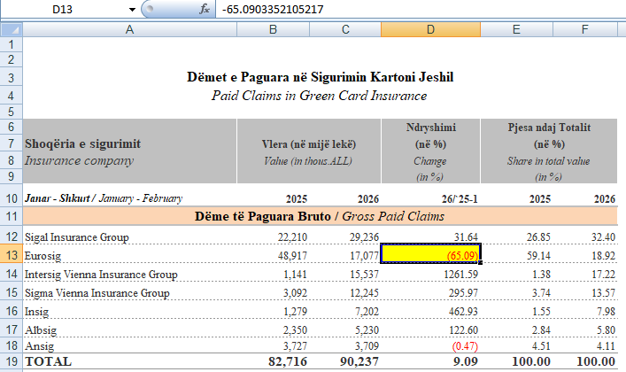 Ajo që bie në sy është se për dy muajt e parë të vitit 2026 pra për muajt Janar-Shkurt, rezulton se një nga kompanitë më të mëdha në tregun e sigurimeve Kompania Eurosig, me pronar Kadri Morina, ka një rënjë drastrike të dëmshpërblimeve për sigurimet motorrike. Thënë shkurt, EUROSIG, pavarëisht se rezulton se ka rritur numrin e primeve të shkruara bruto për Sigurimet Motorike, pra ka rritur fuqishëm të ardhurat, rezulton se kur vjen puna tek aksidentet kjo kompani ka rënie të dëmshpërblimeve. Sic shihet në grafikët, e publikuar nga Autoritetit I Mbikqëyrjes Financiare, dukumentet zyrtare tregojnë se këto dëmshpërblime për Janar – shkurt, 2026 janë ulur me rreth 30% në krahasim me periudhën e një viti më parë, pavarëisht se sigurimet janë rritur.