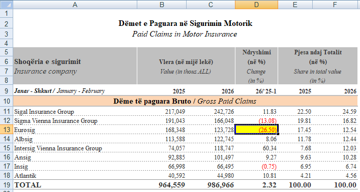 Primet e sigurimit të detyrueshëm motorik, gjatë periudhës janar-shkurt 2026 arriti rreth 2,381 milionë lekë, ose 3.77% më shumë se në janar-shkurt 2025. Produkti MTPL e brendshme, në janar-shkurt 2026, pati një rritje prej 5.26% të vëllimit të primeve të shkruara bruto. Kjo u shoqërua edhe me një rritje të numrit të kontratave prej 7.93% krahasuar me janar-shkurt 2025. Dëmet e paguara bruto në sigurimin motorik për periudhën janar-shkurt 2026 kapën vlerën 987 milionë lekë, duke pësuar një rritje me rreth 2.32% krahasuar me të njëjtën periudhë të një viti më parë.