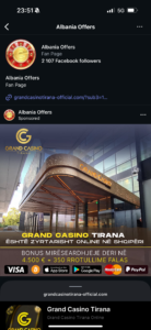 Faqja Albania Offers mban në sfond një foto të stadiumit Arena Kombëtare dhe pretendon se reklamon në emër të një kazinoje lokale. “Zbuloni qindra lojëra, oferta ditore ekskluzive, depozita të sigurta, pagesa të shpejta dhe mbështetje për klientët 24/7 — gjithçka që prisni nga një kazino e klasit të lartë,” shkruan ajo në njërën prej reklamave.